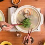 5. Ask guests to take a serving of dipping sauce and season it with Momiji Oroshi and chives and then invite them to pick out from the cooked food in the pot, dip it in the sauce, and eat it. Be sure to watch the pot, skim any foam from the surface, and continue to add broth, vegetables, and seafood slowly to keep the pot full and hot.