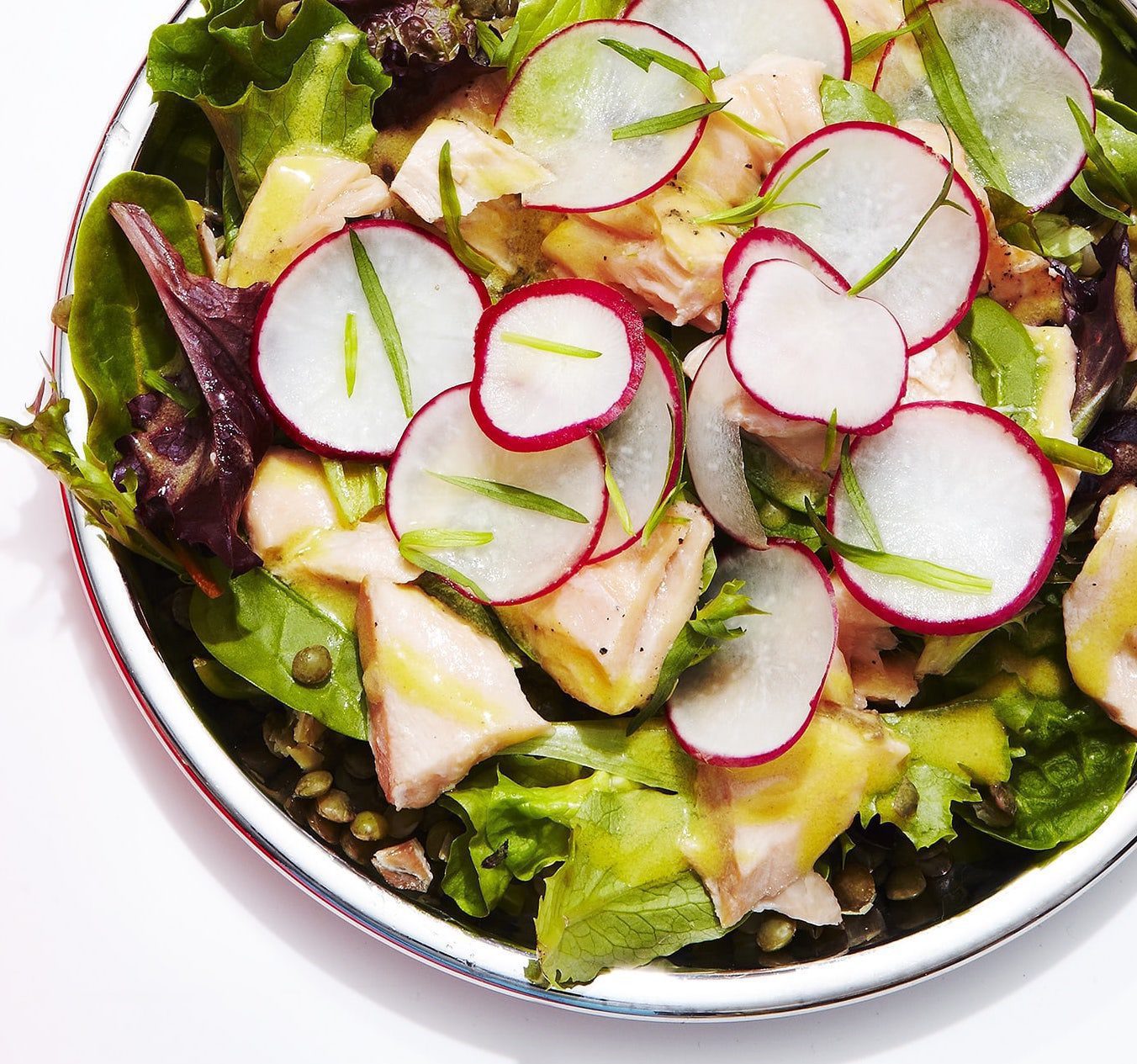 To serve, divide the lentils among four plates. Top with lettuces and salmon chunks. Drizzle a few spoonfuls of the vinaigrette over each salad, sprinkle with tarragon leaves and radishes, season to taste with salt, and serve.