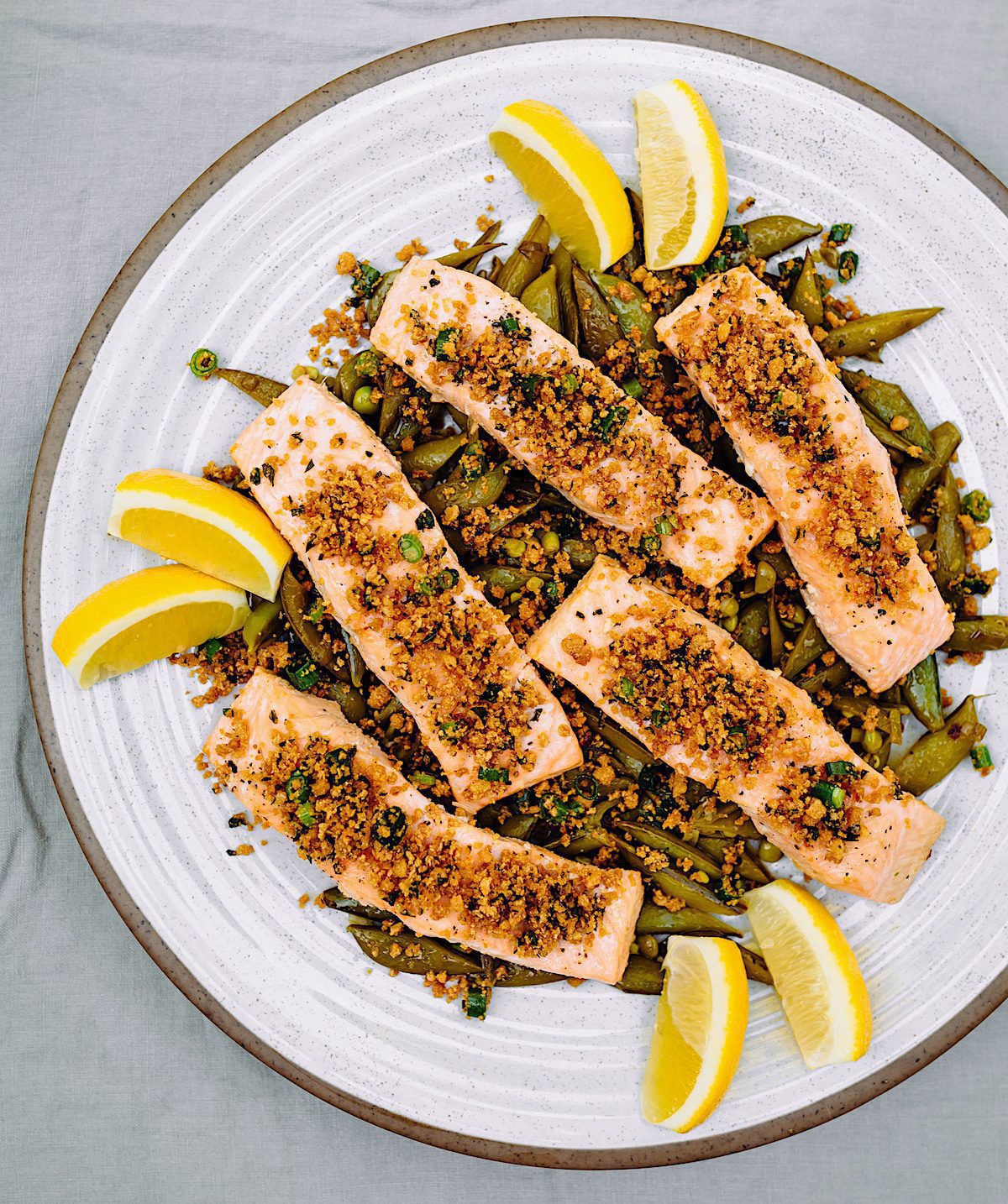4. Arrange the peas on a serving dish, then top with the salmon. Mix the green parts of the green onions into the toasted breadcrumbs, sprinkle on each fillet, and serve.
