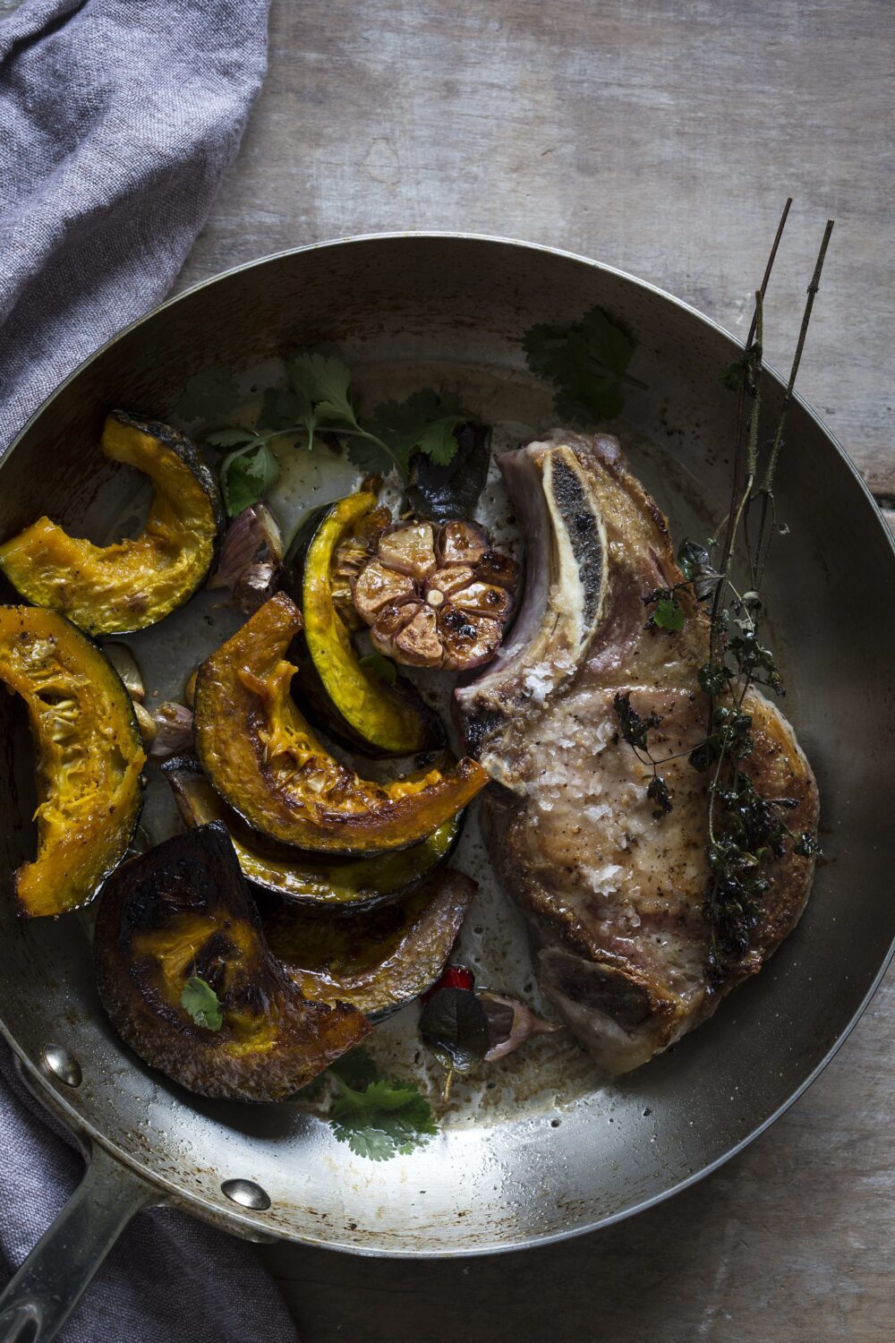 The oven does most of the work for this simple feast by Aran Goyoaga where juicy, gluten free pork chops partner with caramelized squash and garlic and savory-tart, vinegar- kissed browned butter.