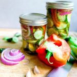 The perfect way to use up an abundance of fresh summer produce, this gluten-free recipe is a very quick way to add a lot of flavor to crunchy cucumbers. Other vegetables work too–beans, hot peppers, carrot strips. The pickles are a great addition to sandwiches and salads, but they’re also amazing right out of the jar!