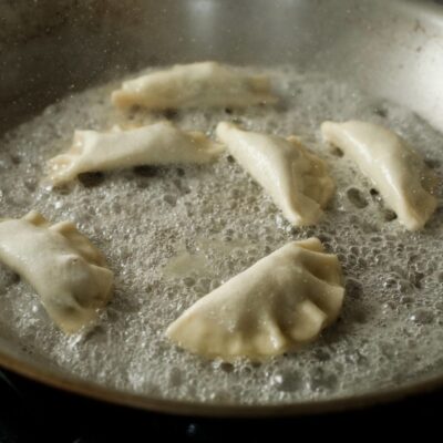 Lightly coat a large skillet (preferably nonstick) with oil and warm over medium-high heat until hot but not smoking. Working in batches, add the pot stickers in one layer to cover the skillet surface. Very carefully, add 1/3 cup water and cover immediately to avoid oil splatter. Lower the heat and simmer 6 to 8 minutes. When the pot stickers begin to sizzle, partially uncover the skillet. When the frying begins to sound like rain, remove the lid. Fry the bottoms until crispy and brown. Transfer to a platter, browned sides up, and cover to keep warm until all of the pot stickers are fried. Serve with your dipping sauce of choice.