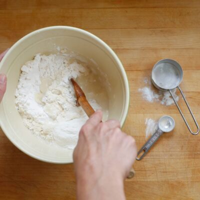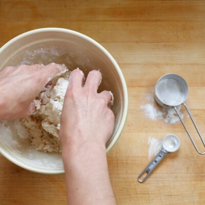 Using your hands, work in up to 2 tablespoons cold water until a cohesive, smooth, but still somewhat wet dough forms. Put the dough into a ziplock plastic bag, squeeze out all of the air, and close.