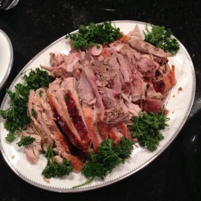 Meanwhile, make the gravy: skim as much of the fat off the top of the pan drippings in the roasting pan to a bowl. In another bowl, mix 3 tablespoons of the fat with enough GF flour to make a thick paste. Heat the remaining pan drippings/reduced basting liquid in the roasting pan on the stovetop; it should be hot and barely simmering but not boiling. Chop the reserved liver into small pieces. Slowly whisk the flour paste into the drippings to thicken the gravy, whisking until it;s smooth. Whisk in the chopped liver. If there isn’t a lot of gravy or it’s too richly flavored, whisk in some chicken broth—and more flour/fat combo if needed—until you have the consistency and flavor you want.