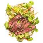 7. Drizzle the remaining dressing over the lettuce mix, then toss gently to coat. Divide the salad between two plates. Add half of the steak to each plate, garnish with peanuts and herbs, and serve.