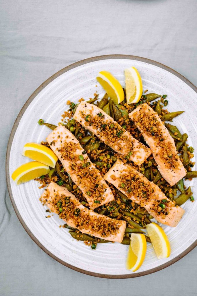 Okay, so technically, this dish is pinkish and green, but somehow, together, it takes on a brownish character that belies its awesomeness, even with the pop of lemon yellow. With herby breadcrumb crunch and plenty of flavor from the salmon and snap peas, this gorgeous, nourishing, quick-prep dinner is one I turn to for weeknights and hosting guests. Get the recipe