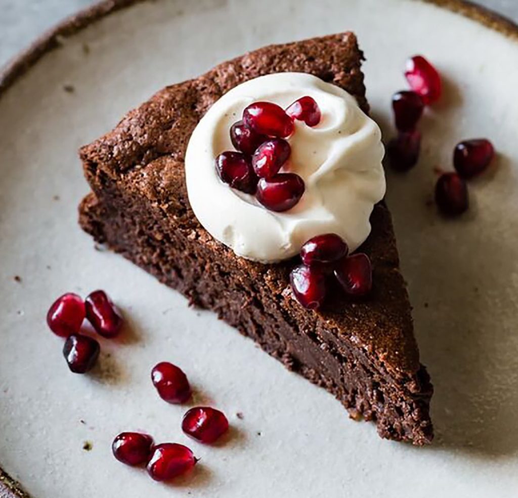 Chocolate Hazelnut Flour Cake with Whipped Mascarpone and Pomegranate