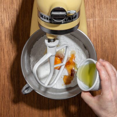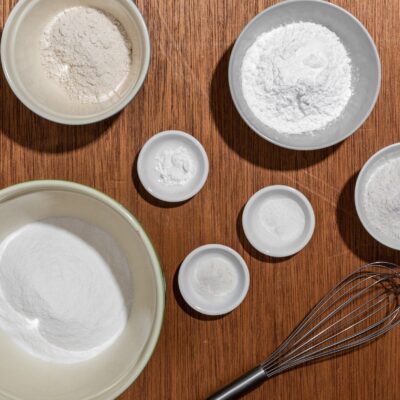 Make the pretzel dough: In the bowl of stand mixer, combine the white rice flour, tapioca starch, brown rice flour, sorghum flour, salt, xanthan gum, and baking powder. Whisk to combine, then fit the stand mixer with the paddle attachment.