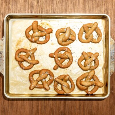 Return the water to a rolling boil, then one at a time, boil the pretzels. If the pretzels immediately float, boil for about 10 seconds, then, using a slotted spoon, return them to the prepared baking sheets. If they sinks, wait for them to float to the top of the water, then remove it. (Though if it’s sticking underwater for a while, it may be stuck to the bottom of the pan; you can gently coax it away with your slotted spoon.) Sprinkle the boiled pretzels very generously with pretzel or kosher salt.