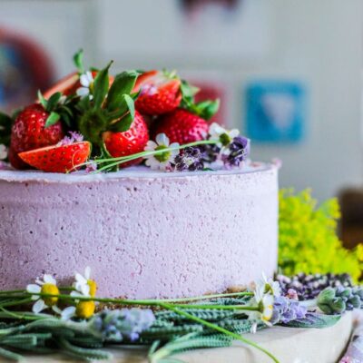 To make slicing a bit easier, simply run your knife blade under hot water to heat it up, wipe it off, slice, and repeat. Serve garnished with a few strawberry slices and flowers, if desired.